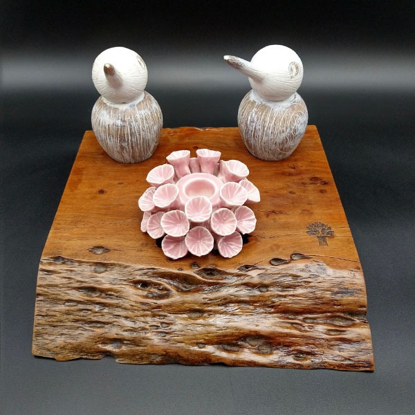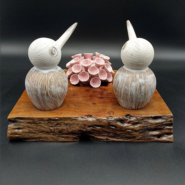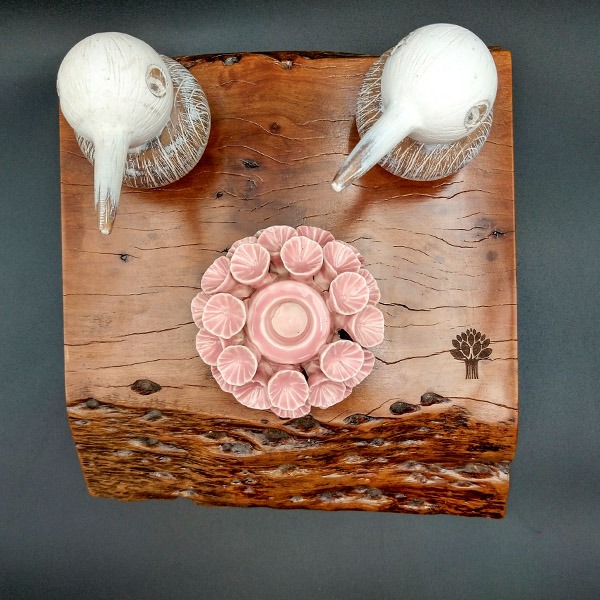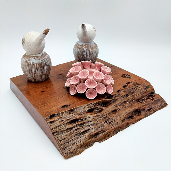 Escultura compuesta por base de madera de Zapote, escultura de vidrio y pájaros torneados.
